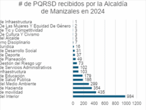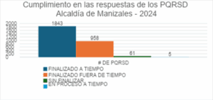 Al cierre de 2024, la Alcaldía de Manizales registró una tasa de cumplimiento del 64% en los tiempos de respuesta a los derechos de petición, con 1.843 PQRSD contestados dentro del plazo legal. Por el contrario, la tasa de incumplimiento fue del 36%, con 958 solicitudes respondidas fuera del tiempo y 61 que, al finalizar el año, seguían sin respuesta a pesar de haber vencido el plazo legal.