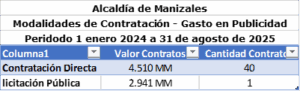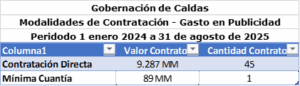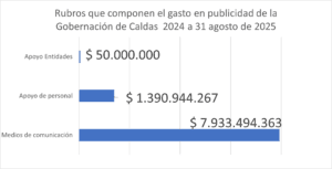 Según datos de SECOP II, entre el 1 de enero de 2024 y el 31 de agosto de 2025, la Gobernación de Caldas celebró 46 contratos de publicidad y divulgación en medios de comunicación, redes sociales y otros espacios, por un valor total de $9.374.438.630. En el mismo periodo, la Alcaldía de Manizales firmó 41 contratos por $7.452.409.819. En ambos casos las cifras incluyen las adiciones presupuestales realizadas en esos contratos.