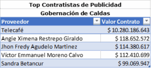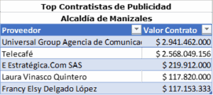 En el caso de la Gobernación de Caldas, el principal contratista en publicidad fue Telecafé. En la Alcaldía de Manizales, el contrato de mayor valor se adjudicó a Universal Group Agencia de Comunicaciones S.A.S., seguido por Telecafé. Los demás contratistas corresponden en su mayoría a personal externo de apoyo.