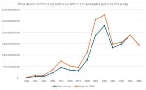 Las cifras de contratos con el Estado así lo confirman. En SECOP I y II se encontraron 452 contratos con entidades estatales, por un valor aproximado de $1,26 billones (valor nominal) desde su creación. Estas cifras muestran que Infotic es un proveedor muy importante dentro del sector público colombiano.
