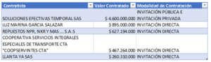 - De los 5 mayores contratistas de Promueve Más, 4 contrataron previamente durante la anterior administración de Luis Carlos Velásquez (Soluciones Efectivas Temporal SAS, Luz Marina García Salazar, Repuestos Npr, Nkr Y Mas … S.A.S, Cooperativa Servicios Integrales Especiales De Transporte CTA «Coopservintes CTA»), y uno es nuevo con la entidad (Llanta Ya SAS).