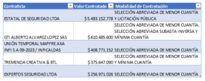 - De los 5 mayores contratistas de INFICALDAS, 3 contrataron previamente durante la anterior administración de Luis Carlos Velásquez (Estatal de Seguridad Ltda., GTI Alberto Álvarez López SAS y Tremenda Creativa & BTL), y dos son nuevos con la entidad (Unión Temporal Mapfre Axa Infi S.A09-2023 / Inficaldas y Expertos Seguridad LTDA).
