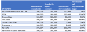 - Al verificar la contratación de EMPOCALDAS en el grupo de datos de SECOP II en Datos Abiertos se encuentra que la información de contratistas, modalidad de contratación y descripción se encuentran completas en su mayoría, sin embargo, no se encuentra disponible la información de los representantes legales.